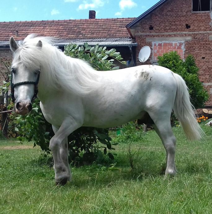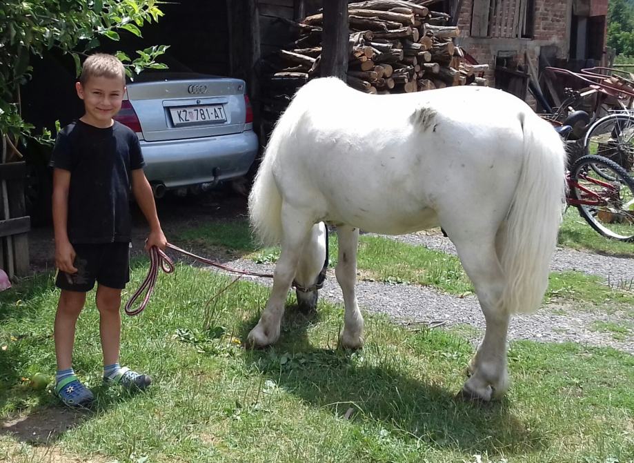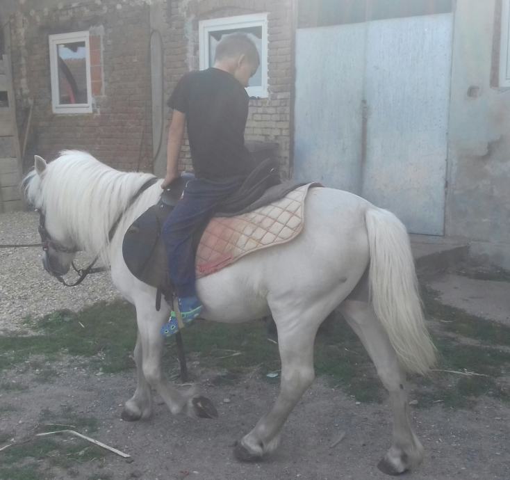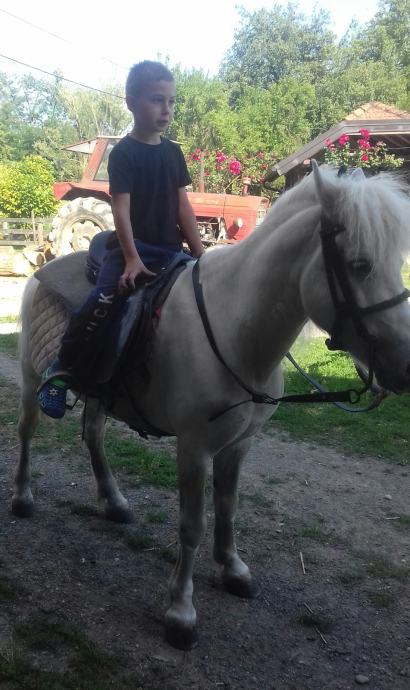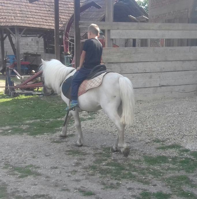 Konj visine 115 cm. Jako miran, drag, umiljat, naučen na djecu, ujahan, sa svom opremom za jahanje u kompletu, star 7 godina. Mogu ga jahati i odrasli jer je srednje veličine. Prodaje se isključivo u dobre ruke. Okolica Križevci. Moguća zamjena za kukuruz, sjeno, neki motor ili može za auto prikolicu. Cijena po dogovoru.