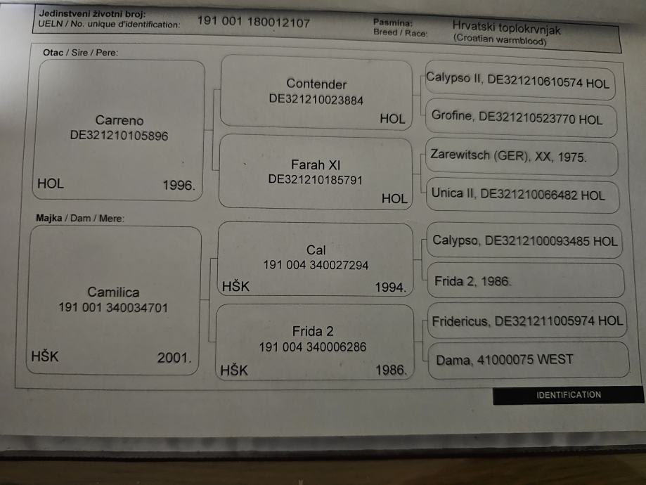 Miran , odličan rasplodnjak . Ima trajnu licencu . Daje noge , ulazi u prikolicu . Visine 167-8 cm . Izrazito moćan pastuh , čvrstih nogu , dobrih stavova .