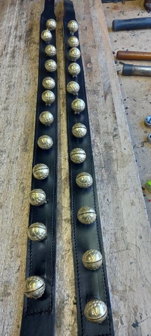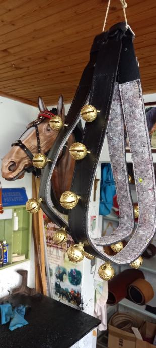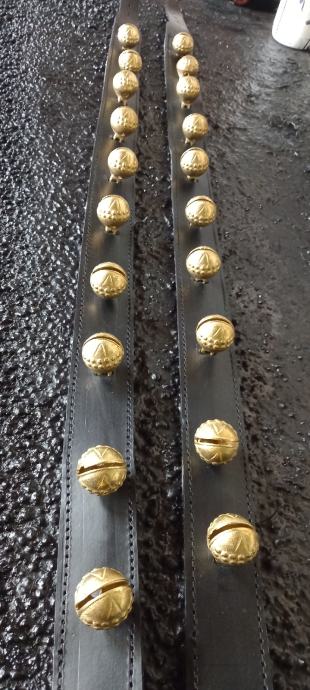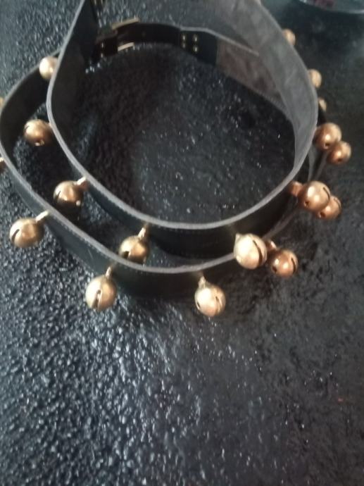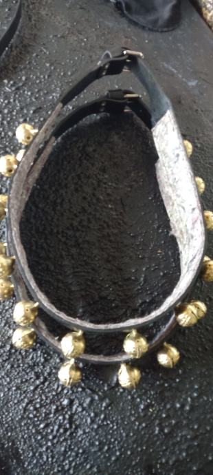 Kožna ogrlica sa praporcima , sa 10 praporaca od mesinga , mogućnost izrade razne izvedbe , novo , slanje poštom .