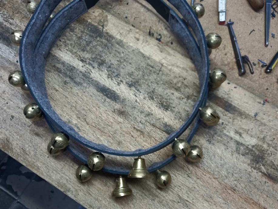 Ogrlica sa 12 praporaca i 1 zvono , od mesinga , na koži , sa podstavom od filca , garancija , novo , slanje poštom .