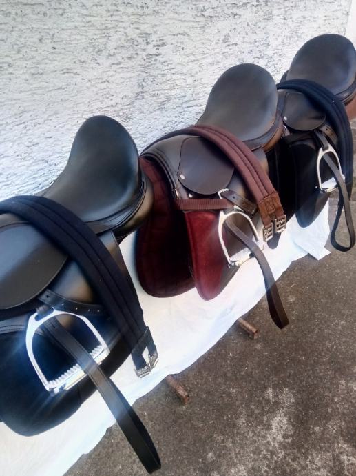 Sedlo , sve od kože , crno ili smeđe , univerzalno , u kompletu : kolan , podsedlica , stremeni , uzengije , novo , garancija , slanje poštom , dodatne fotke ili video na viber ili whatsapp .