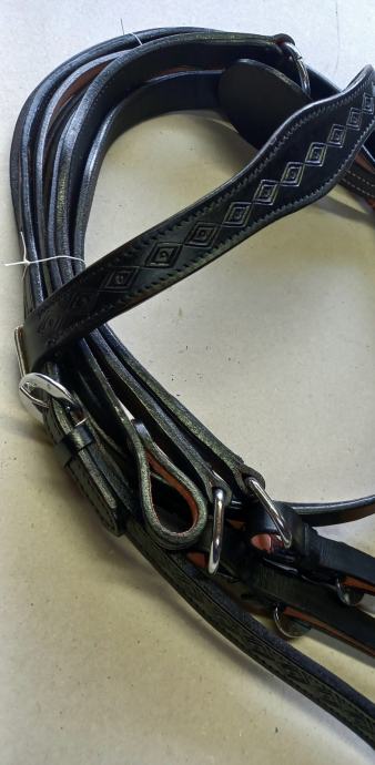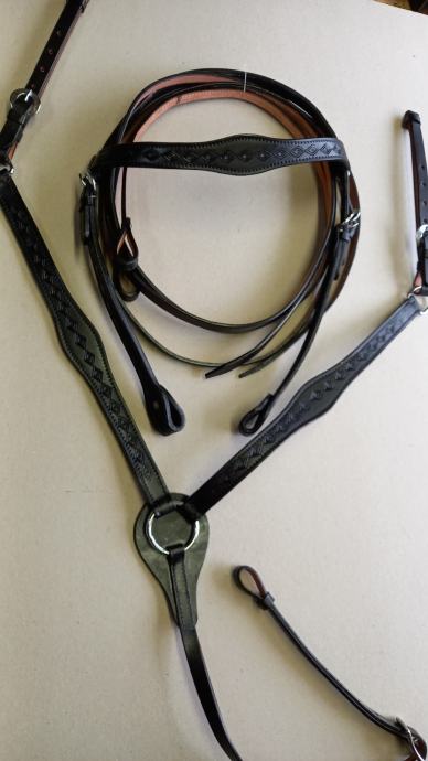 Western oglavina sa dizginima i pršnjakom za sedlo , koža crne boje , srednja veličina , prodaja samo u kompletu , info na viber ili whatsapp .