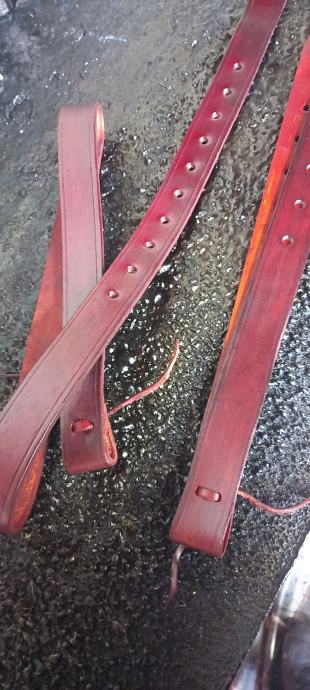 Remeni za kolan western sedla , prednji , koža izrazito snažna iii debela 5 mm , širina 37 mm , krači remen dužina 55 cm , dulji remen 145 cm , novo , povoljno , slanje poštom .