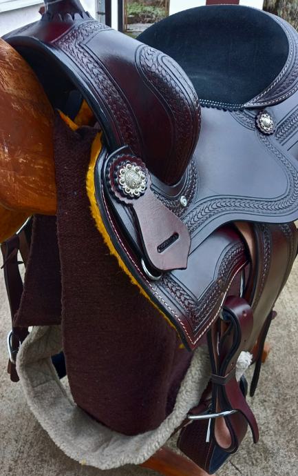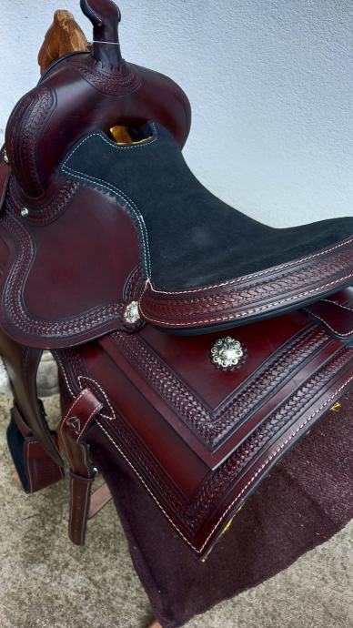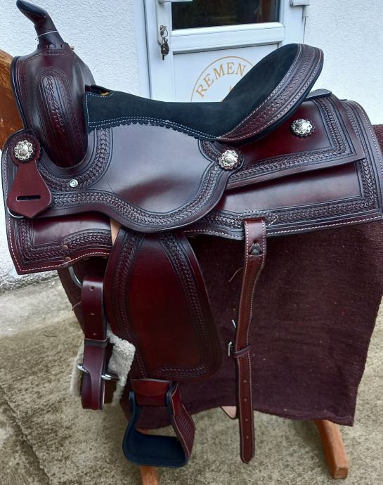 Western sedlo , 17 incha , koža vrhunske kvalitete smeđe boje u kompletu sa remenima i kolanima prednjim i zadnjim kao i sa podsedlicom , novo , dodatni info na Viber ili Whatsapp .