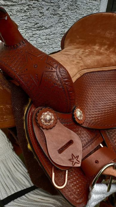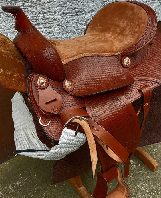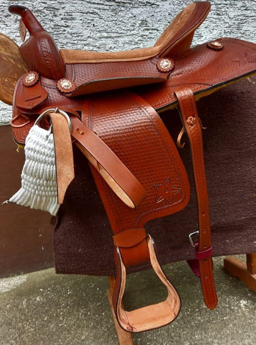 Western sedlo , 16 incha , od kvalitetne kože , sa svim djelovima : kolan prednji , kolan zadnji , remeni za kolane , podsedlica , novo , slanje poštom moguće uz dogovor , viber ili whatsapp