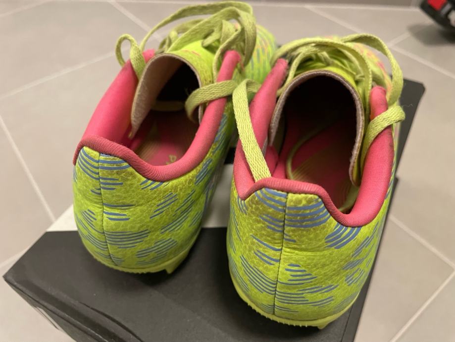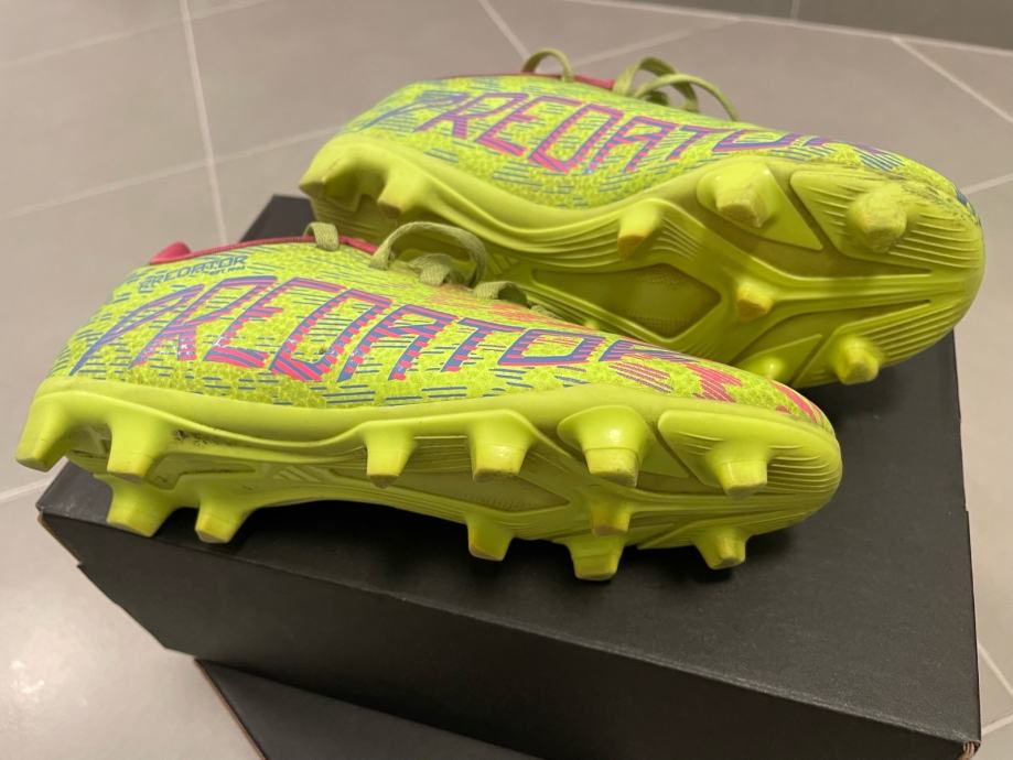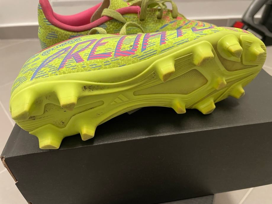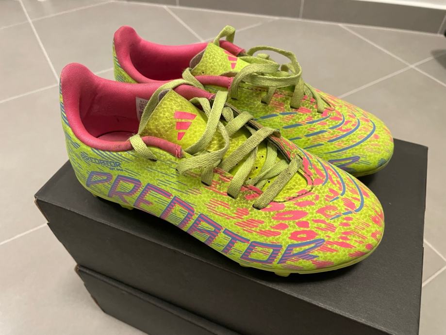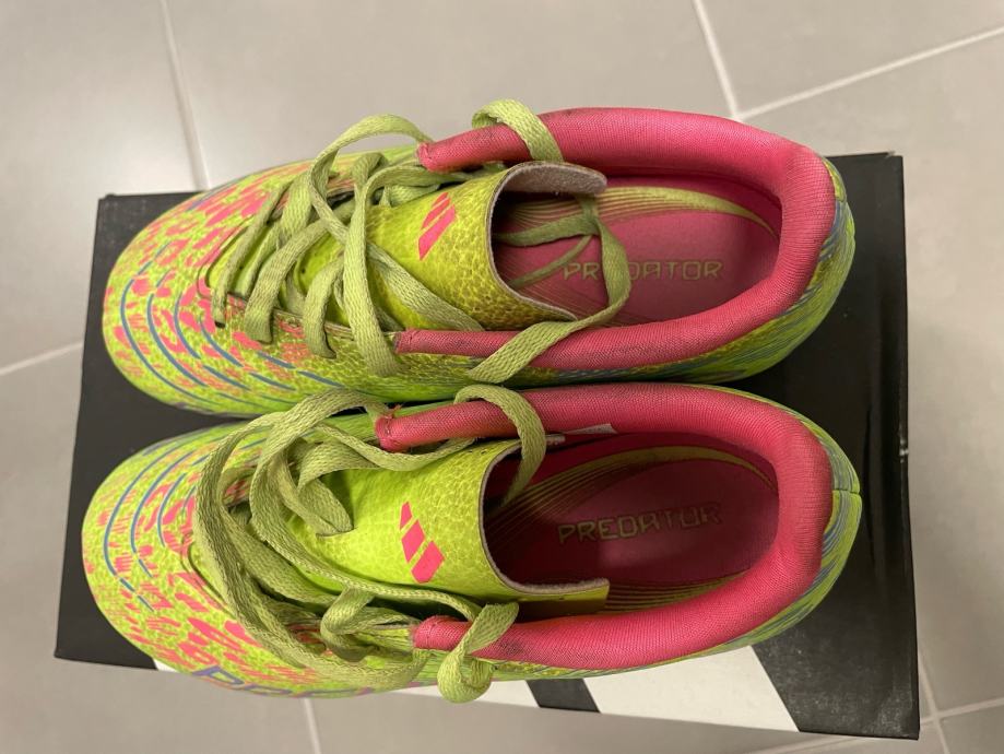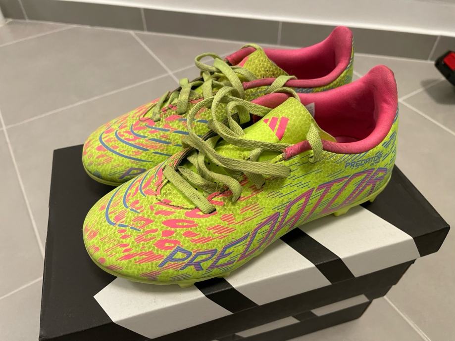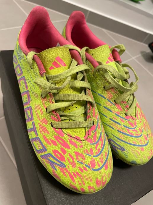 Dječje adidas Predator Club FG/MG kopačke u veličini 33. Kopačke su upečatljive neonsko zelene boje s rozim leopard uzorkom. Pogodne su za igranje na različitim podlogama zahvaljujući kombiniranom FG/MG đonu.