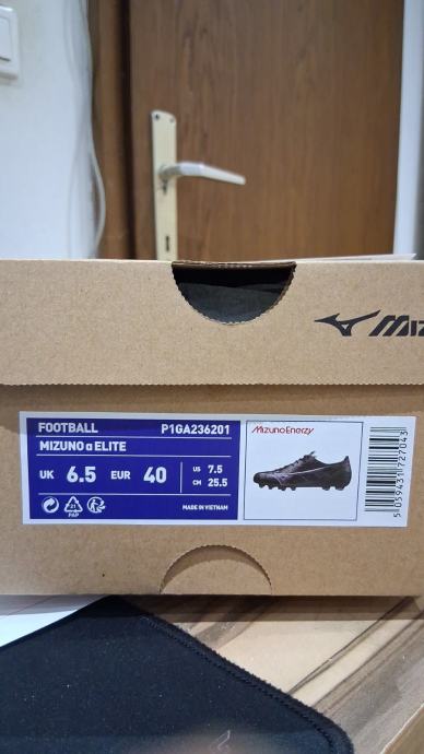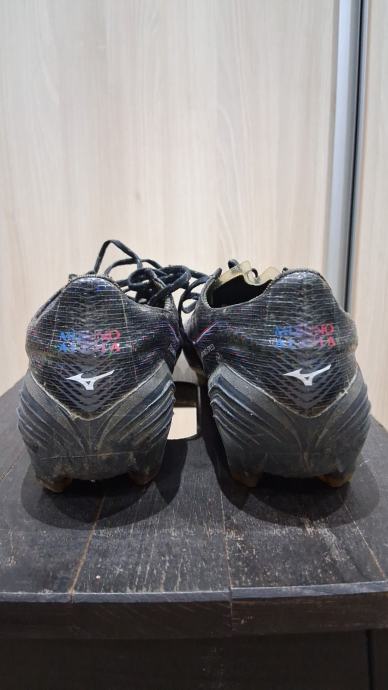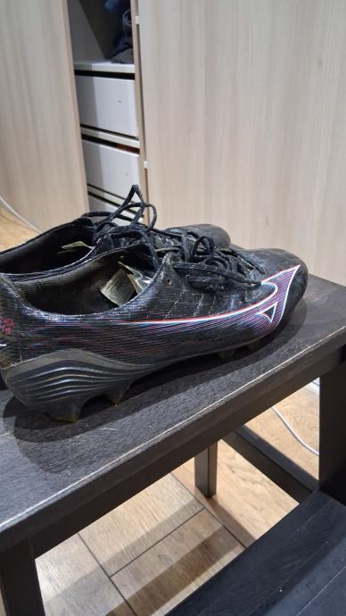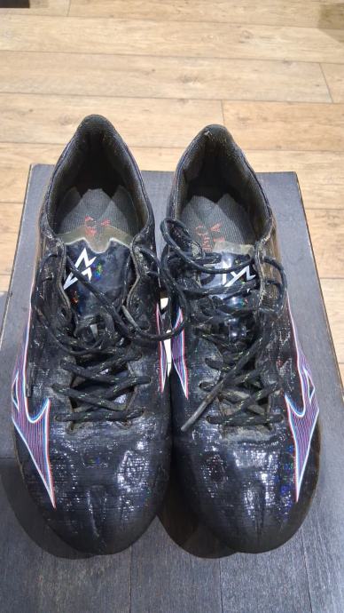 Kopačke Mizuno Alpha Elite (II klasa) broj 40 crne boje s crveno-plavim naglascima.