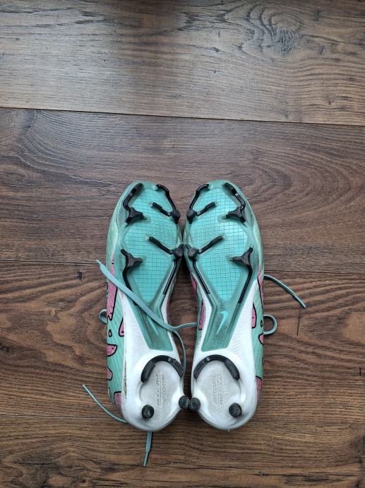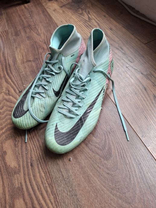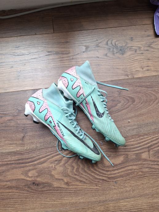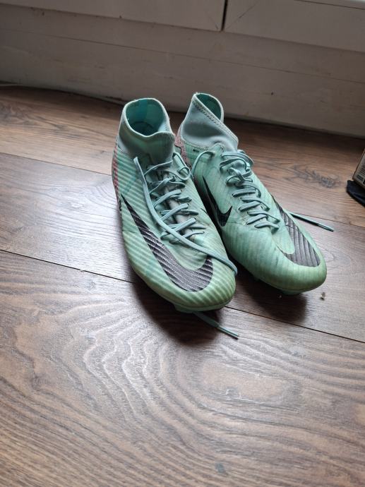 Prodajem Nike Mercurial kopačke u mint zelenoj boji s crnim Swoosh logom. Radi se o modelu s visokim gležnjem koji pruža dobru potporu stopalu tijekom igre. Kopačke imaju čepove na potplatu, prikladne za prirodne travnate podloge. Broj 43.