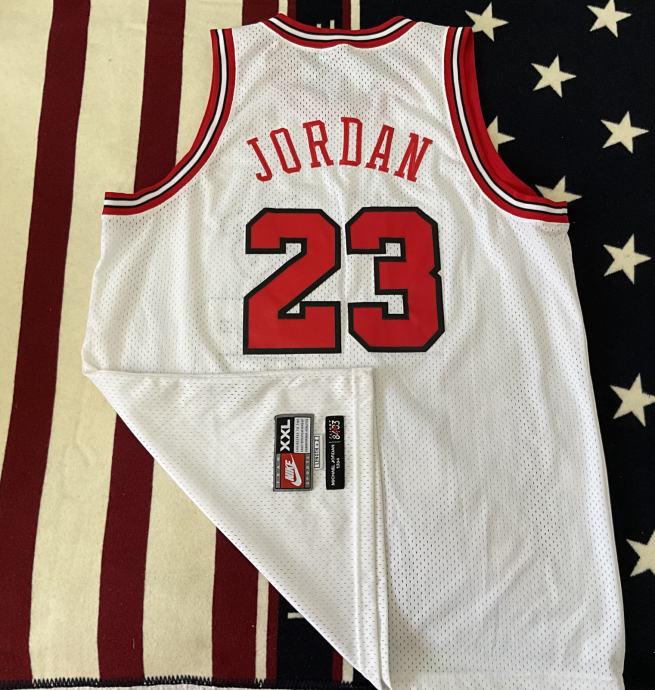 Nike autentična 8403 Flight Jersey Prezent and Michael JORDAN broj 23 od Chicago Bulls u veličini xxl… Djeci je perfektan za Basketball navijača i Collectors kao oni sa ovim bijelom dresom Isa official ABA oznakama