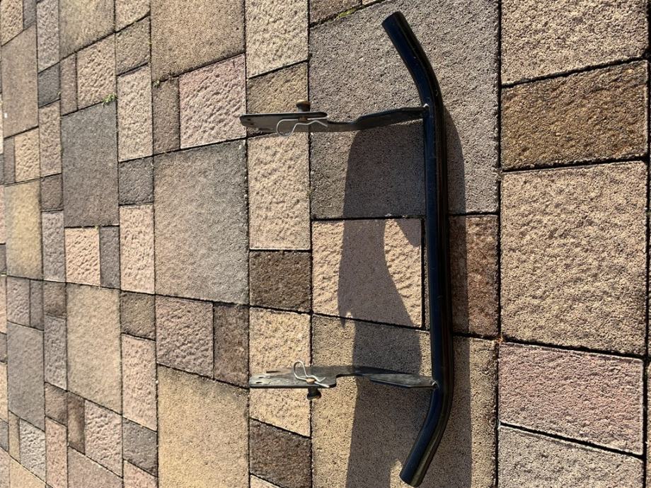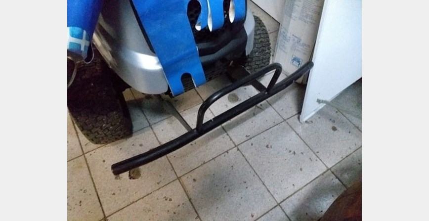 Branik je rađen od željeznih cijevi, jer u dučanu imaju samo nešto što zovu branik sa cijevima od lima ko na drški od metle. Nema ni dodatnu cijev iznad branika tak da ako imate neku voćku koja raste malo u koso možete razbit svjetlo i haubu ko moja susjeda, popravak skoro skuplji od kosilice. Nosači su rezani na laser od 5mm lima, tak da po ovom slobodno možete i slonove vozit. Ako netko želi branik bez gornje cjevi ko na zadnjoj slici, budem se zamjenil sa susjedom. MOŽETE DIGNUT KOSILICU poslije košnje kao na drugoj slici, za očistit i oprat kosište. Kosilicu možete dignut za gurtnu prek grane od stabla ko moj kum, ili prek kolotura, ili sa flašencugom ko moja kčer od 10 godina.