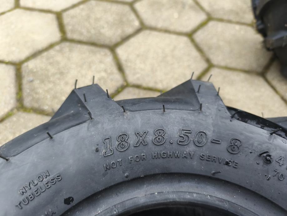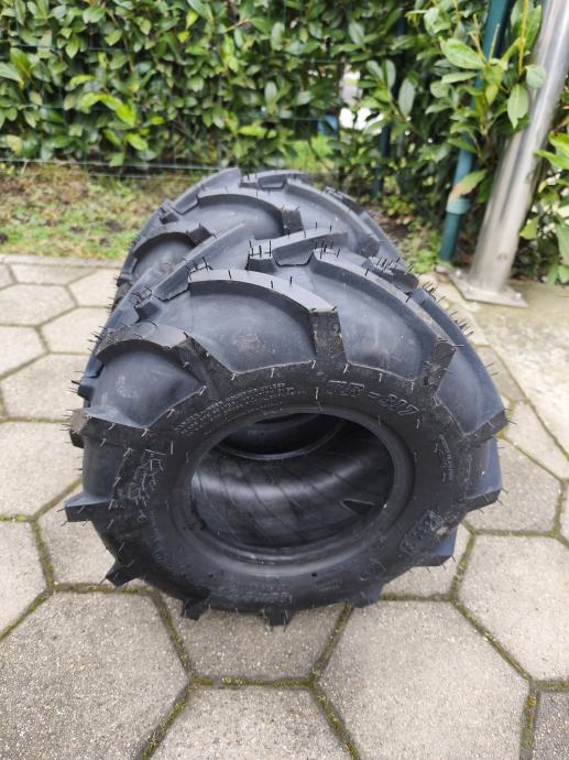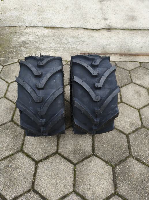Na prodaju su dvije nove gume s traktorskim profilom za traktor kosilice ili rider kosilice. Mi smo kupili 4 komada za rider Husqvarnu, ali stavili smo samo na pogonske zadnje kotače jer nema potrebe na prednje i stvarno ide uz bilo koju uzbrdicu (ali i po snijegu) tako da su 2 komada ostala višak. Dimenzije su 18x8,5x8. Mogu se montirati više manje na sve traktor kosilice sa tom ili sličnom dimenzijom. Gume su nove, nikad montirane. Cijena iznosi 120 eura za obje i fixno je. Lokacija je Kutina. Upiti samo na 098833328.