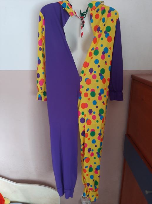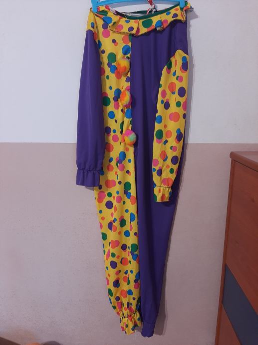 Dječji kostim za maškare klaun. Nošen par puta. Očuvan. Vel. 122-128. Dužina od vrha ramena do dolje 108cm, širina od pazuha do pazuha 47cm, dužina međunožja 55cm