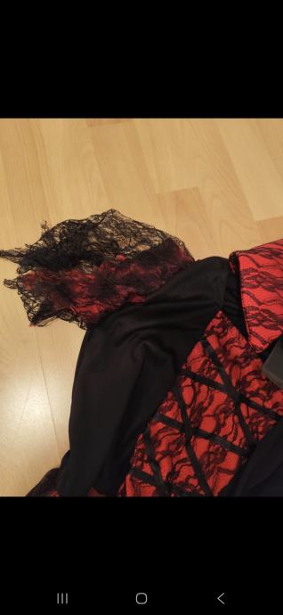 Prodajem dječji kostim vampirice za veličinu 152-164. Kostim se sastoji od crno-crvene haljine s čipkom i upečatljivim uzorkom.