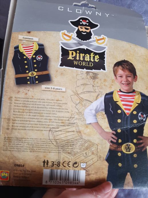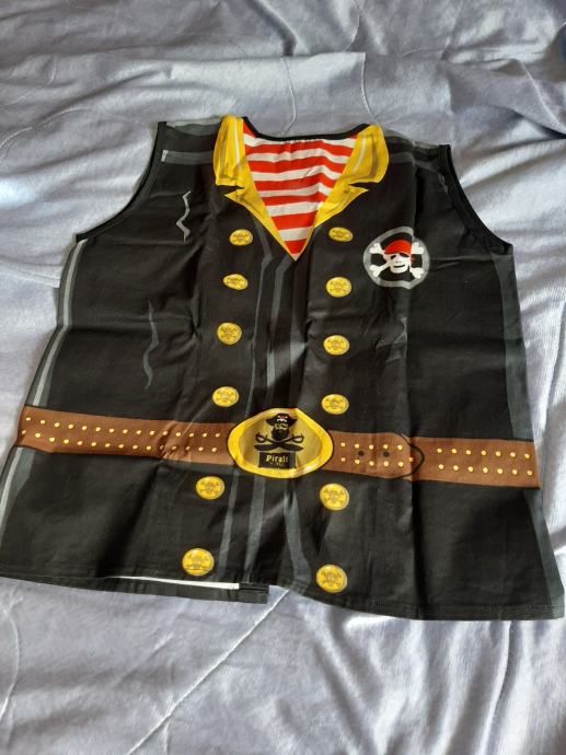 Dječji prsluk za pirate - gusare. Jednom obućeni, bez oštećenja. Vel. 134-140. Dužina od vrha ramena do dolje 54cm, širina od pazuha do pazuha 47cm