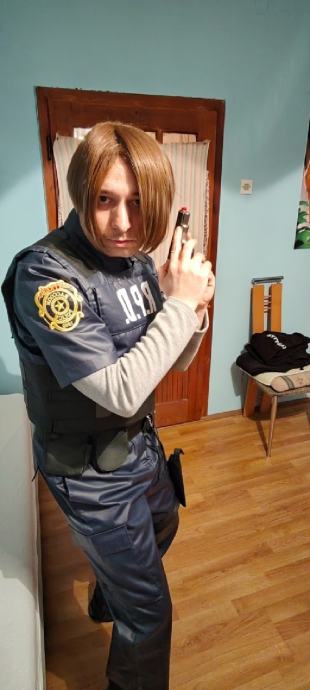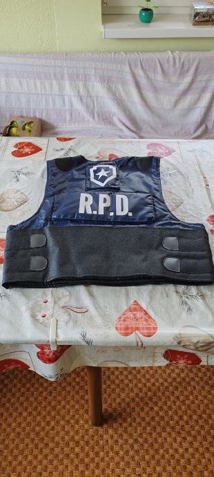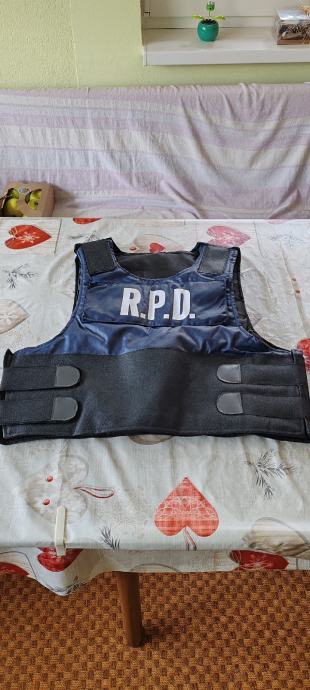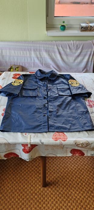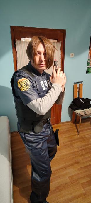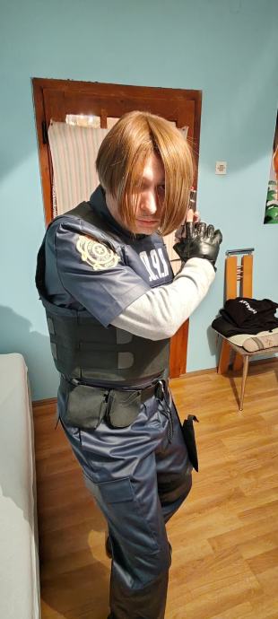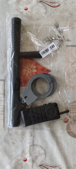 Novi kostim za maškare ili noć vještica,potpuno nov nošen samo jednom.Uz njega ide sve što je na fotkama,kostim se prodaje u kompletu s ostalim dodacima.Kostim:hlače i košulja L veličina,zaštitni prsluk i rukavi za ruke,perika,remen,opasač s futrolom za pištolj i torbicama za dodatke,dva remena za nogu za zatezanje futrole,štitnici za laktove i koljena i rukavice.Dodaci:pendrek,toki-voki,lisice za ruke s ključem,policijski pištolj i pumperica.Moguća primopredaja u Osijeku ili slanje poštom,poštarina 20 €.
