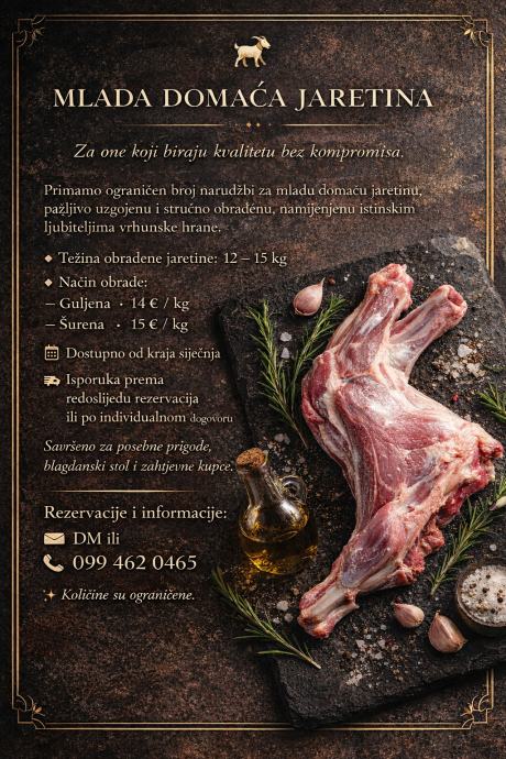 Primamo ograničen broj narudžbi za mladu domaću jaretinu, pažljivo uzgojenu i stručno obrađenu, namijenjenu istinskim ljubiteljima vrhunske hrane.