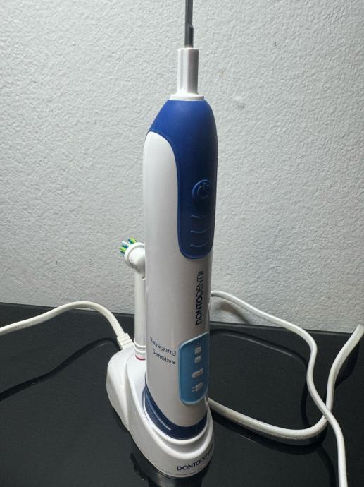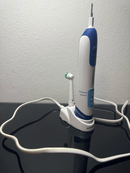 Električna higijenska četkica Dontodent s dva nova nastavka i postoljem za punjenje.