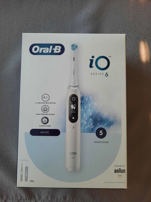 Oral-B iO 6 Series bijela električna četkica postavlja nove standarde te vam pruža potpuno drugačiji doživljaj. Napredna tehnologija pruža najnježnije, najtemeljitije i najnaprednije čišćenje zubi. Najpoželjnija tehnologija ujedno je i najelegantnija. Četkica je obogaćena revolucionarnom magnetnom iO tehnologijom. Oral-B iO 6 Series bijela električna četkica sastoji se od okrugle glave koja ima nježne mikrovibracije, za 100 % zdravije desni te 100 % bolje uklanjanje zubnih naslaga od klasičnih četkica.