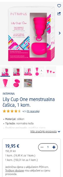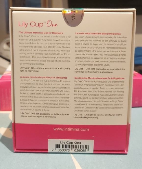 Intimina menstrualne čašice za višekratnu upotrebu sakupljaju menstrualnu krv umjesto da je upijaju te tako predstavljaju zdraviju alternativu tamponima i ulošcima. Intimina Lily Cup One čašica je izrađena od jedinstvenog komada baršunasto glatkog medicinskog silikona koji ne nakuplja mirise, ne iritira sluznicu niti podržava razvoj bakterija. Model Lily Cup One u jednoj veličini, s dvostrukim rubom protiv izlijevanja i prstenom za lakše vađenje predstavlja savršen odabir za početnice.