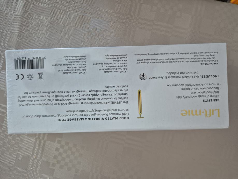 Liftmie Gold Plated masažer pozlaćen je 24-karatnim zlatom. Ovaj vibrirajući masažer posebno je osmišljen za oblikovanje kontura, maksimalno upijanje seruma za lice te poticanje limfne drenaže. Pozlaćeni vibrirajući masažer Liftmie inovativno je rješenje za savršeno oblikovanje kontura lica zahvaljujući vibraciji od oko 6000 puta u minuti. Nanesite serum ili ulje na čistu kožu lica te koristite masažer za limfnu drenažu ili upotrijebite jači, čvršći pritisak kako biste postigli čvrste konture lica. Uređaj je malen, lagan, lako prijenosan te vrlo jednostavan za korištenje.