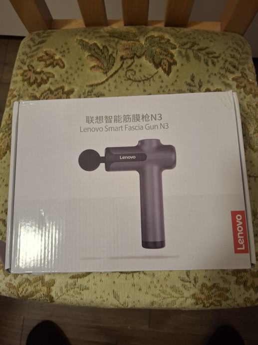 Prodajem Lenovo Smart Fascia Gun N3, masažer u obliku pištolja namijenjen opuštanju mišića i oporavku. Uređaj je sive boje, kompaktnog dizajna. Dolazi s nastavkom za masažu te USB kabelom za punjenje.