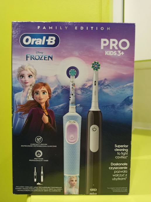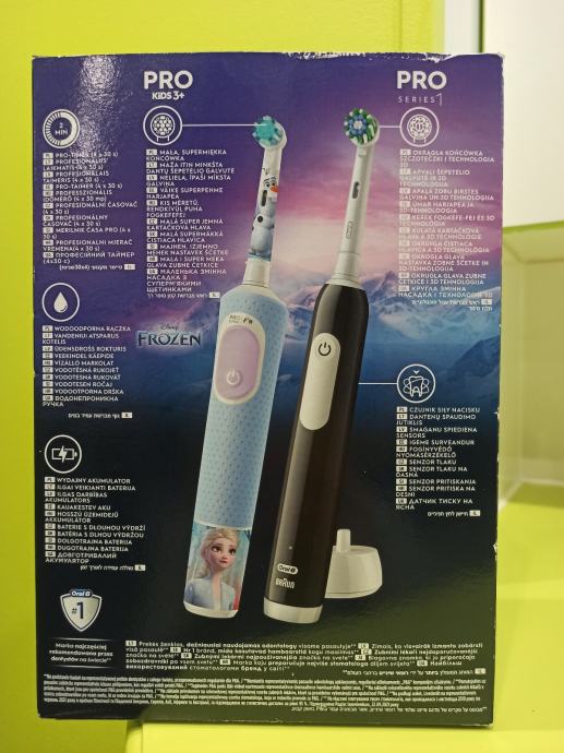 Oral-B Family Edition, Pro Series1 + Kids 3+ Frozen obiteljski paket uključuje jednu električnu četkicu za zube Oral-B Pro Series 1 za odrasle i jednu Oral-B Pro Kids električnu četkicu za djecu stariju od 3 godine.