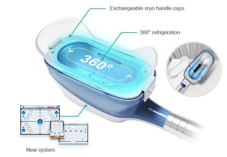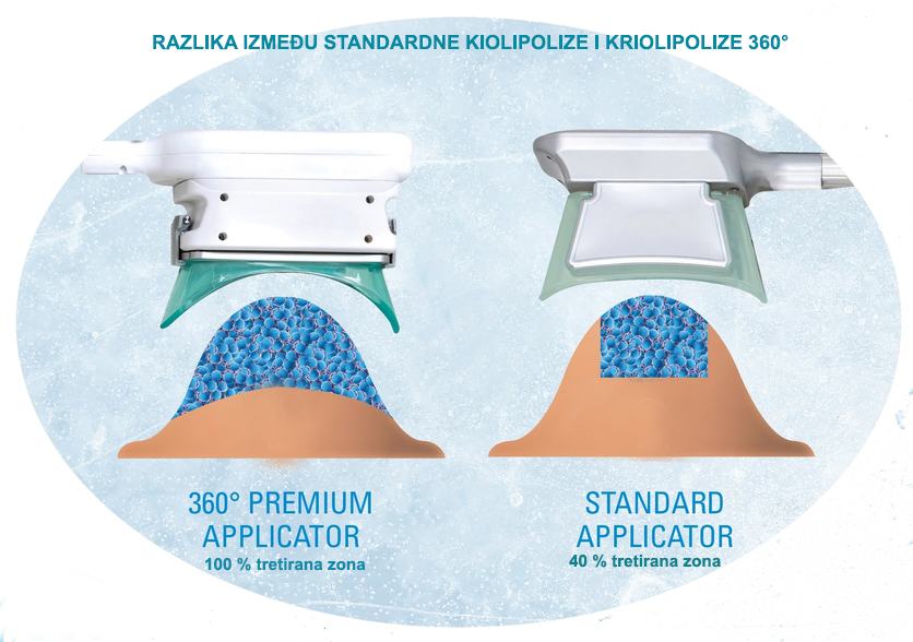 Najnovija tehnologija Cryo 360° koristi posebne aplikatore sa 100% učinkovitošću u razbijanju tvrdokornih masnih naslaga koje se drugim metodama ne mogu ukloniti. Prednost nove tehnoligije je u tome što cijeli aplikator pokriva veću površinu dijela koji se tretira dok su prethodni aplikatori pokrivali maximalno 40% tretiranog djela. Tako se u ovom jednom tretmanu uz kraće vrijeme djelovanja u svega 30 minuta postiže 100%tni učinak na razbijanje masnih stanica.