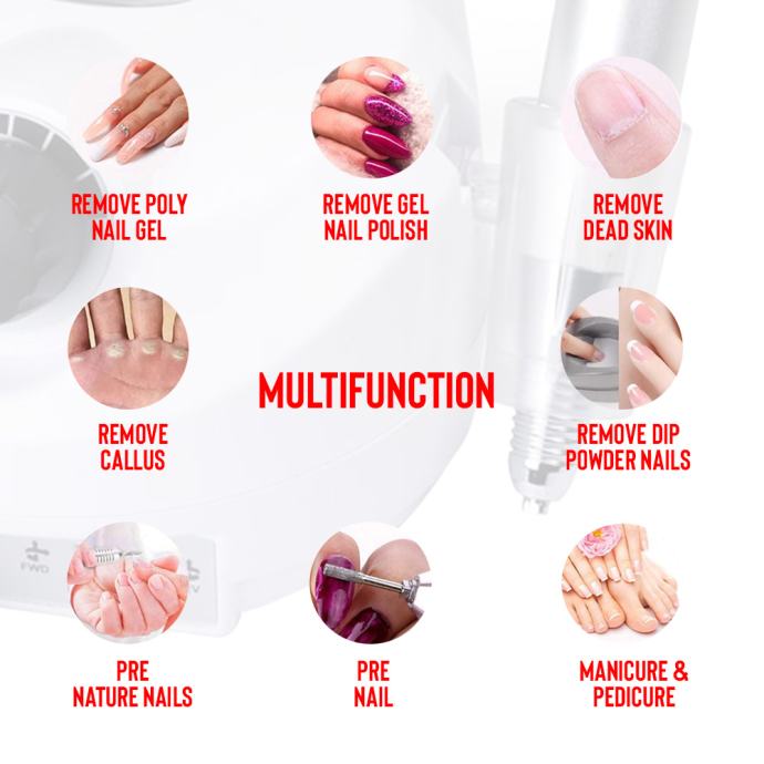 Vrh ove električne rašpice može doseći brzinu od 0 do 25.000 okretaja u minuti, a za bilo koju potrebu moguće je obrnuti smjer. Podešavanje vam omogućuje da odaberete postavku koja najbolje odgovara vašim potrebama, zadržavajući u svakom slučaju razinu vibracije na ergonomskoj dršci olovke. Šest metalnih rezervnih dijelova u pakiranju također vam omogućuje izvođenje različitih vrsta tretmana na noktima, osiguravajući različite načine uporabe.