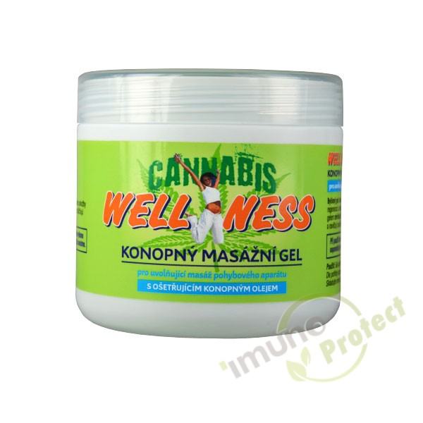 Wellness masažni gel od konoplje hidratizira i osvježava kožu, smanjuje upale i ukočenost u mišićima i zglobovima. Sadrži hladno prešano ulje konoplje i ekstrakte ostalih biljaka kao što su eukaliptus, arnika, timijan, ginko biloba, lavanda i ružmarin. *Pomaže ubrzanju procesa ozdravljenja i obnavlja zaštitnu barijeru kože. Idealan je za kompletnu njegu kože, posebno nakon kupanja, hidratizira i osvježava.