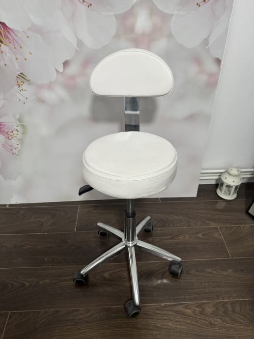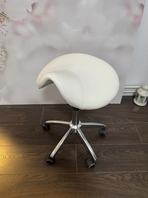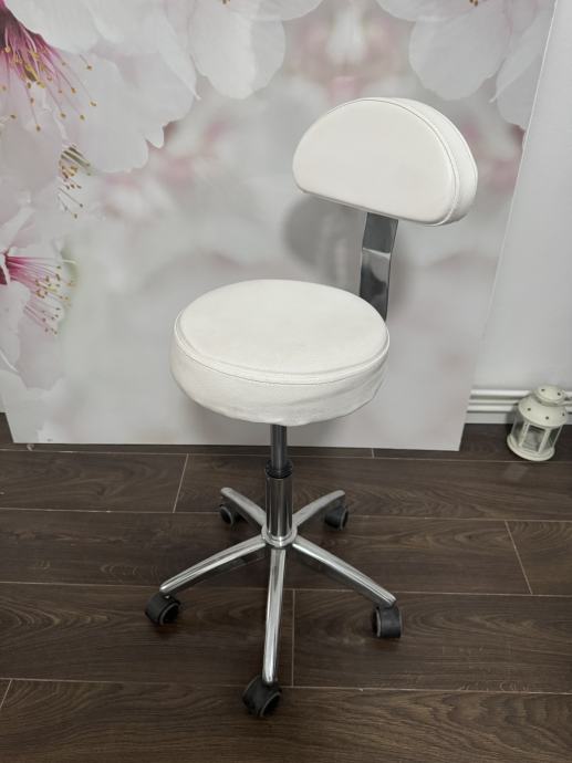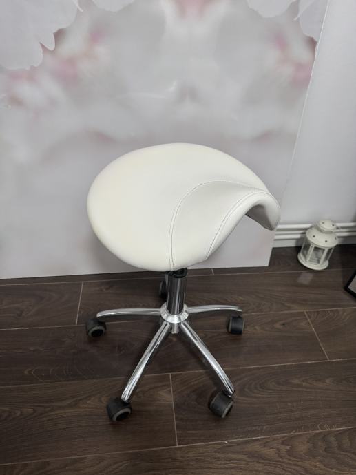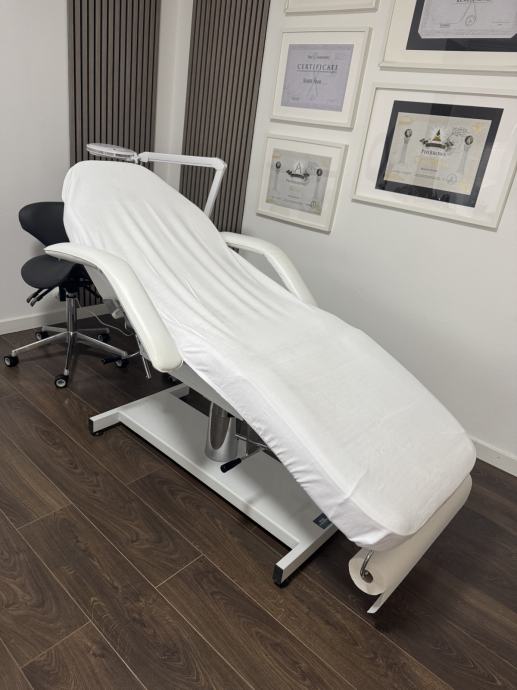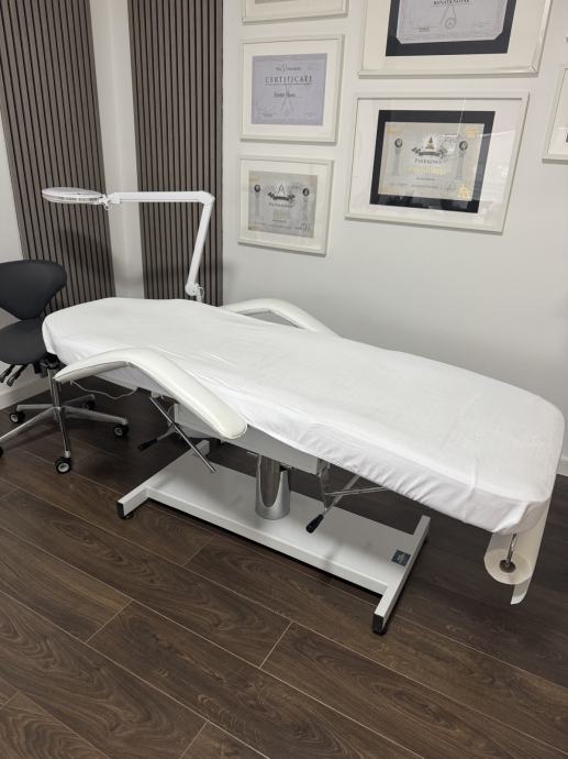 Kozmetički trosekcijski ležaj MENT-hidraulično podizanje i spuštanje od 63 do 80 cm.Okretan 360 stupnjeva.Kočnica za fixiranje u željenom položaju.Bijele presvlake s metalnim okvirom .Rupa s oduškom za masažu,odvojivi rukonasloni i držać za rolu papira.330€