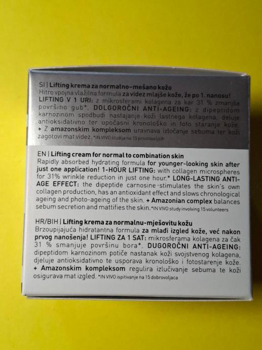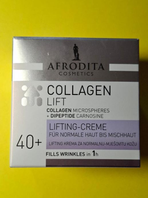 Linija Afrodita Collagen Lift krema za normalnu i mješovitu kožu učinkovito se bori protiv znakova starenja. Brzoupijajuća hidratantna formula Afrodita Collagen Lift kreme može pomoći da koža izgleda mlađe već nakon prvog nanošenja. Kolagene mikrosfere smanjuju površinu bora za čak 31 %*. Krema ima i dugotrajno djelovanje protiv starenja jer dipeptid karnozin stimulira vlastiti kolagen kože, djeluje antioksidativno i usporava starenje kože. Osim toga, Amazonov kompleks regulira lučenje sebuma te koži pruža mat izgled.