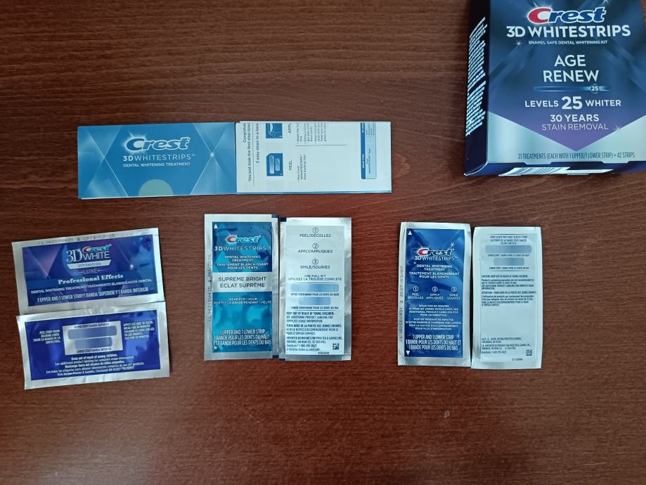 - Nakon 30 minuta korištenja Crest 3D Professional / nakon 60 minuta korištenja Crest Supreme Bright ili Age Renew trakica, odstranite trakice za izbjeljivanje zubi