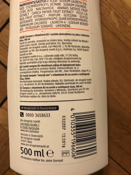 Balea obiteljski šampon s vitaminom B3 i voćnim ekstraktima za suhu i oštećenu kosu , 500 ml - dva komada