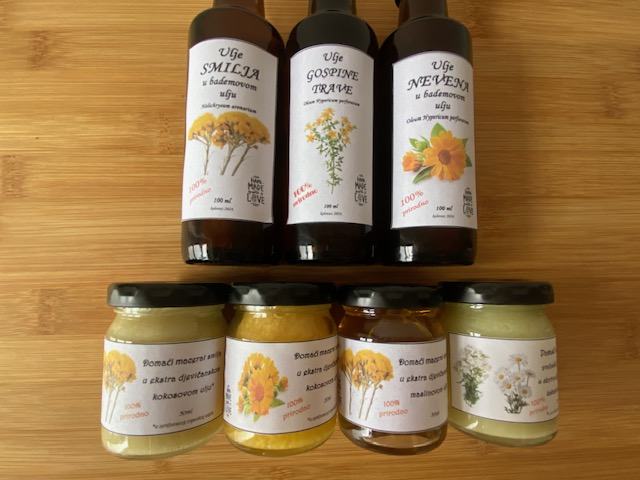 ** Pogledajte i naše ostale oglase: melem od kantariona, melem od smilja, melem od stolisnika i kamilice, melem od nevena, melem od ružmarina, koprive, mente i piskavice, čisti macerat nevena u ekstradjevičanskom kokosovom ulju, čisti macerat smilja u ekstra djevičanskom kokosovom ulju, domaća EKO marmelada od divljeg šipka, domaći sirupi od cvijeta kadulje, domaći sirup cvijeta bazge, domaći ručno rađeni sapuni, domaće kantarionovo ulje, ulje za rast i protiv opadanja kose, EKO kapi ružmarina...