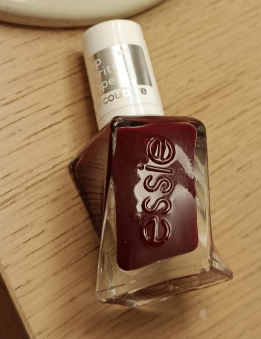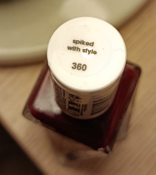 Lak za nokte brenda Essie, nijansa Spiked with Style (360). Ne znam koliko se na slici vidi, ali radi se o tamno bordo crvenoj boji bogatog i dubokog tona.