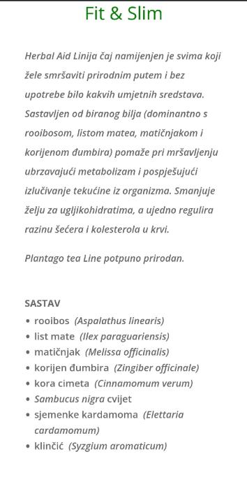 Herbal Aid Linija čaj namijenjen je svima koji žele smršaviti prirodnim putem i bez upotrebe bilo kakvih umjetnih sredstava. Sastavljen od biranog bilja (dominantno s rooibosom, listom matea, matičnjakom i korijenom đumbira) pomaže pri mršavljenju ubrzavajući metabolizam i pospješujući izlučivanje tekućine iz organizma. Smanjuje želju za ugljikohidratima, a ujedno regulira razinu šećera i kolesterola u krvi.