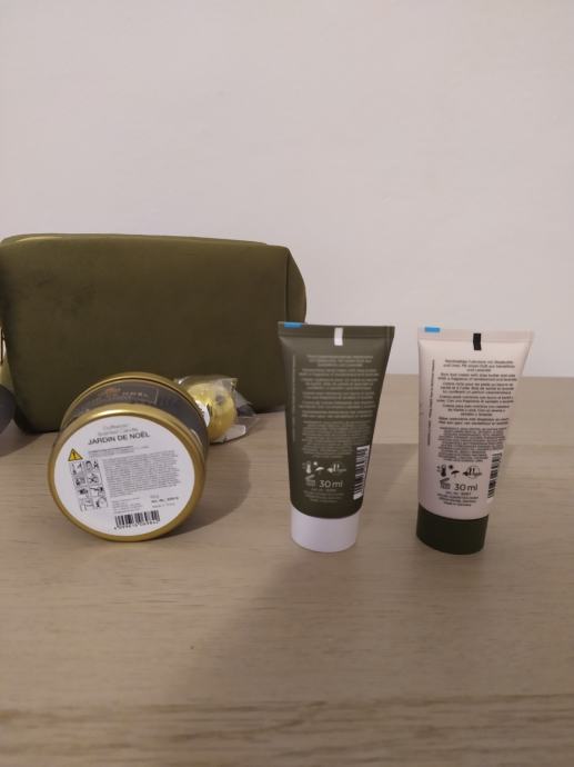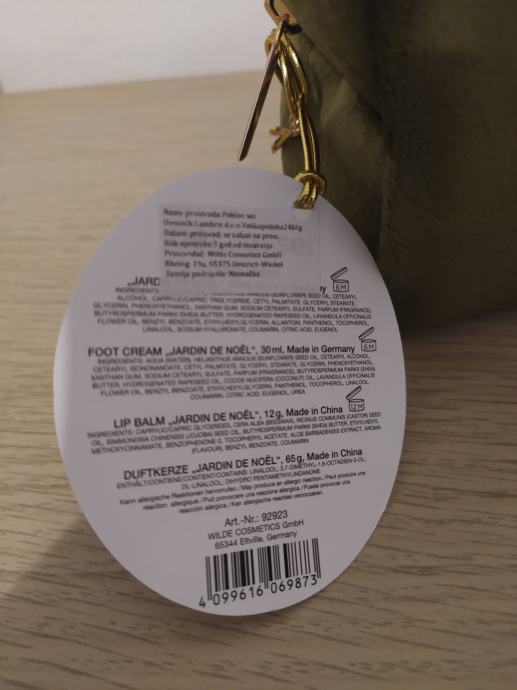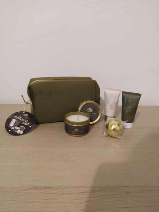 Prodajem novi, neotvarani kozmetički set Jardin De Noel Set Deluxe. Set se sastoji od nesesera, balzama za usne, mirisne svijeće, kreme za ruke i kreme za stopala.