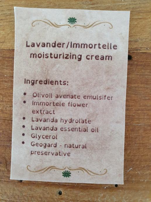Hidratanta krema za lice od Lavande i Smilja dubinski njeguje kožu te briše sitne bore. Odlične je mazive teksture, lijepo se upija i ima predivan prirodni miris.