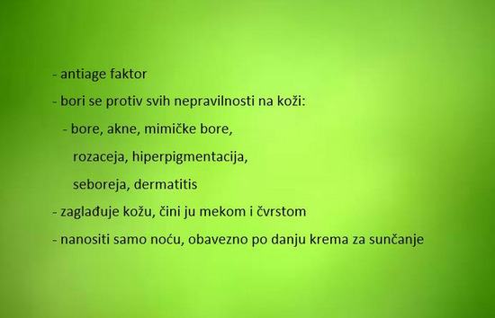 Prirodna, učinkovita, bez konzervansa, s prirodnim mirisom sastojaka ulja nevena i vitamina A u obliku retinil palmitata.