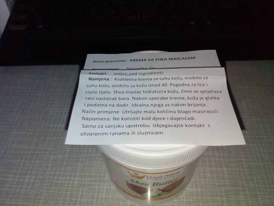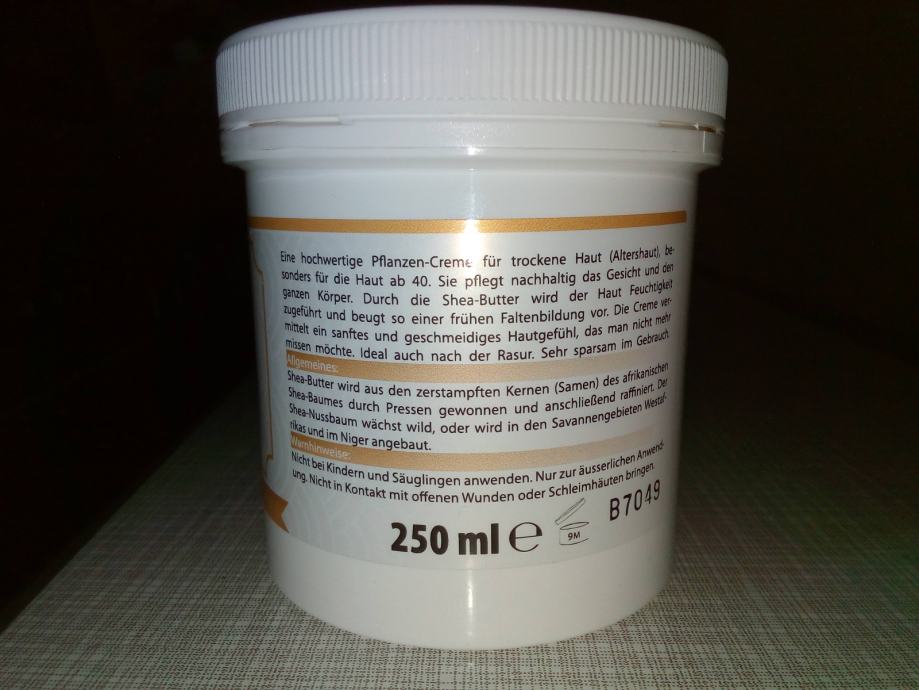 Proizvedeno u Njemačkoj. Kvalitetna krema za suhu kožu, osobito za kožu iznad 40 godina. Pogodna za lice i cijelo tijelo. Shea maslac hidratizira kožu, čime se spriječava rani nastanak bora. Nakon upotrebe kreme, koža je glatka i podatna na dodir. Idealna njega za nakon brijanja. Način primjene : utrljajte malu količinu, blago masirajući. Napomena : ne koristite kod djece i dojenčadi. Samo za vanjsku upotrebu. Izbjegavajte kontakt s otvorenim ranama i sluznicom.