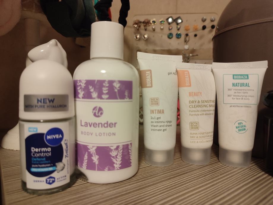 Nivea mini deo roll on novi ,bio baza mini kreme (mlijeko za čišćenje lica, gel za intimnu njegu i krema za lice), body losion lavanda samo isproban