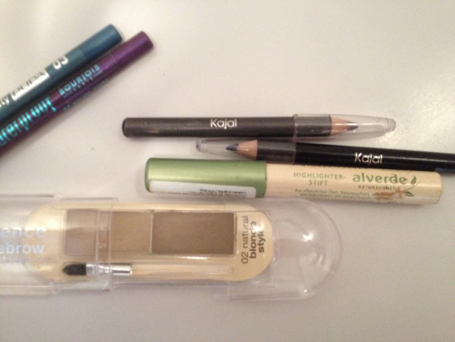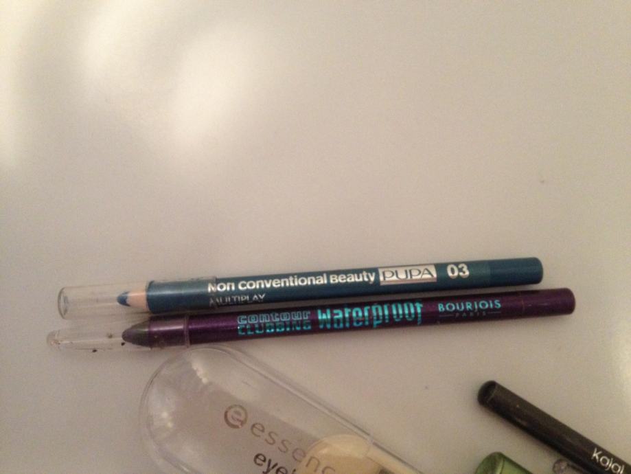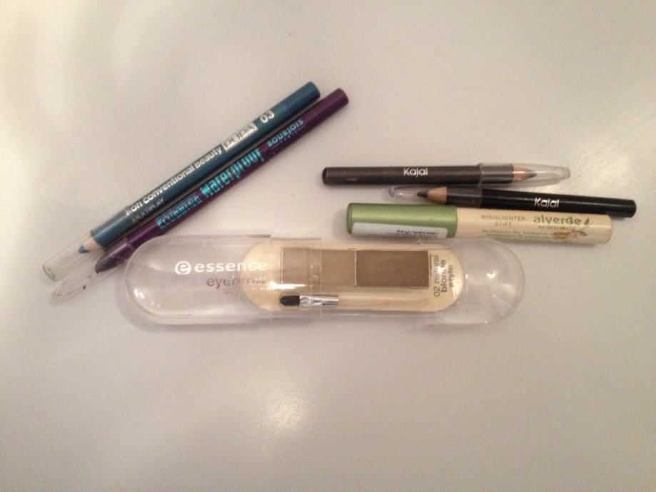 Lot sadrzi nekoristeni Essence set za obrve, Pupa petrolej zelenu olovku, Bourjois ljubicastu olovku, Alverde bijelu masnu debelu olovku, te crnu i sivu kajal olovku.