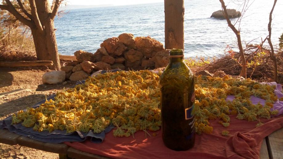 Macerat smilja napravljen od svježih mladih divljih cvjetova smilja ubranih na otoku Visu, koji su 2 mjeseca na tamnom i toplom mjestu ležali u hladno prešanom, organskom ulju suncokreta. Ono je laganije i brže se upija u kožu od tradicionalno korištenog maslinovog ulja. Maceratu je dodana mala količina antioksidativnog co2 ekstrakta ružmarina (prirodan proizvod) radi dodatne stabilnosti tj. trajnosti. Macerat je spravljen u 6 mjesecu 2022 godine te je valjan najmanje do 6 mjeseca 2023 godine.