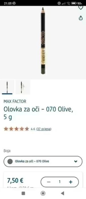 Nova Max Factor maslinasto zelena olovka za oči 070 Olive, poznata po svojoj mekoj teksturi koja omogućuje precizno iscrtavanje linija i lako blendanje za postizanje "smokey eyes" efekta.