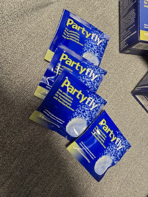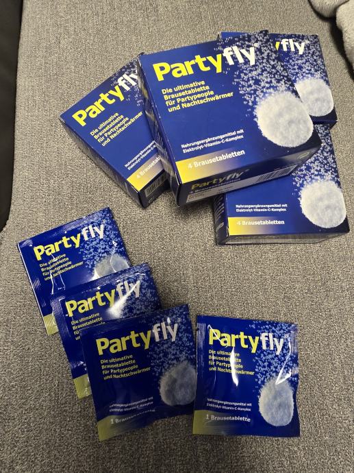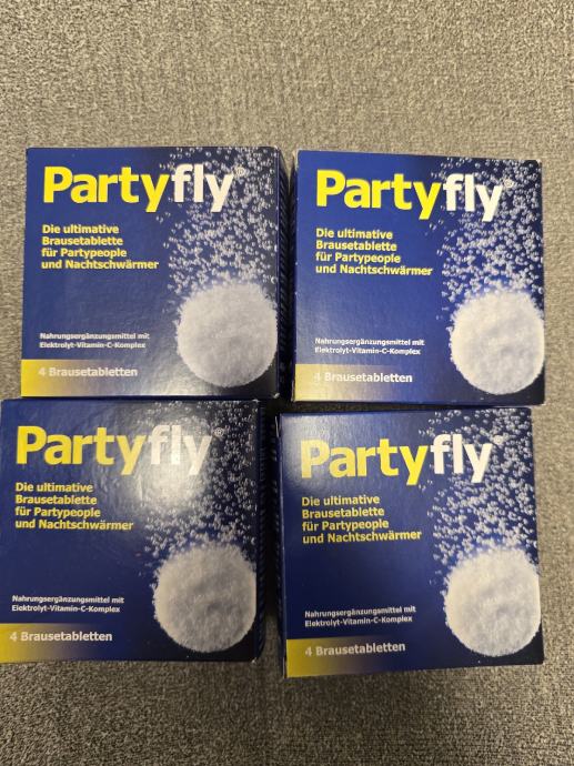 Partyfly su šumeće tablete koje sprječavaju mučnine drugi dan nakon partijanja. Rastope se u 2dcl vode. U kutiji se nalaze 4 šume će tablete,cijena za kutiju 8€.