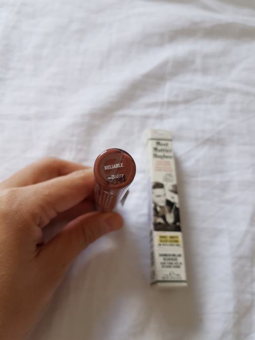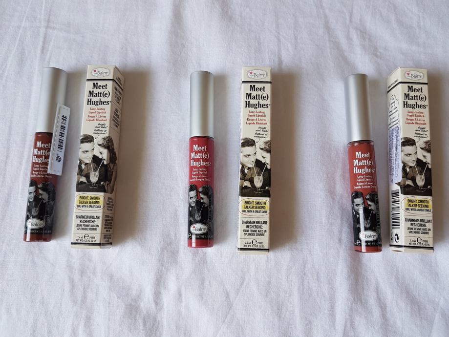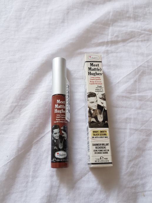 Tekući mat ruž za usne, marke theBalm. Novi i nikada otvoren niti korišten. Nijasna je nova boja, smećkasta nude nijansa. Tekući ruž je iznimno postojan, daje mat izgled usnama i ima okus peperminta. U trgovini plaćen 150kn. Slike kako stoji na usnama skinute s interneta.