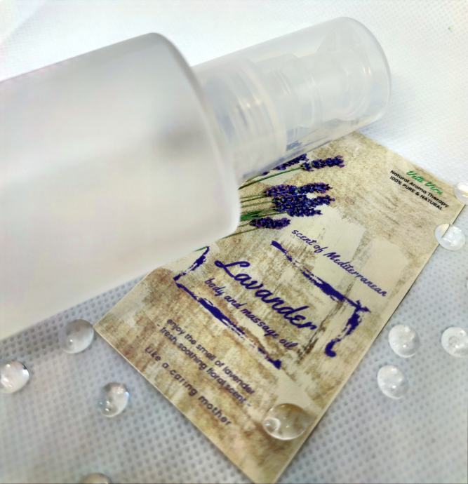 Sastav ulja za masažu i seruma: bademovo ulje, jojoba, vitamin E, eterično ulje lavande prave