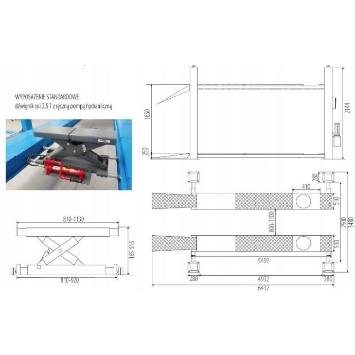 četverostupni, elektrohidraulička dizalica za geometriju/optikuplatforme s udubljenjima za okretne ploče i ekspanzijske pločemehanička blokada visine pneumatski otpuštenapodesivi položaj jedne od platformisavršeno zaštićen hidraulički cilindarprethodno rastegnuta pocinčana opremakoloturnice velikog promjerablokada dizalice u slučaju otpuštanja ili lomljenja oputeupravljanje liftom sa sigurnim naponom od 24Vsigurnosni uređaji u skladu s EN1493:2010Tehnički opis: nosivost: 5000 kgnapajanje: 400v/50hzdovod zraka: 6-8 bara max.snaga motora: 2,2 kwvisina dizanja: 1800 mmrazmak: 3000mmdužina platforme: 5492 mmširina platforme: 510razina buke: