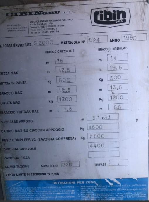 Prodajemo građevinski kran - dizalica CIBIN GRU S 2000