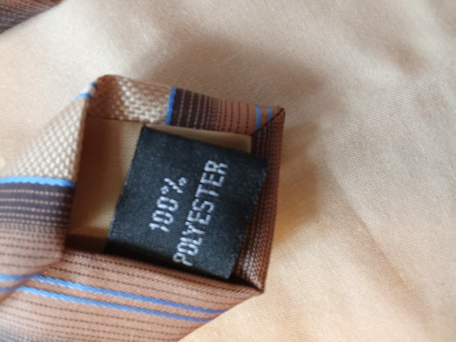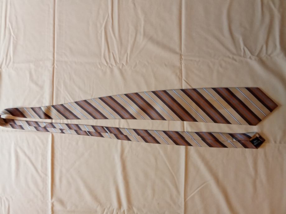 Prodajem rabljenu kravatu s elegantnim uzorkom pruga u smeđim i bež nijansama. MAXCLUSIV kravata izrađena od 100% poliestera, idealna za poslovne i svečane prilike. Klasičan dizajn koji se lako kombinira s različitim odijelima.